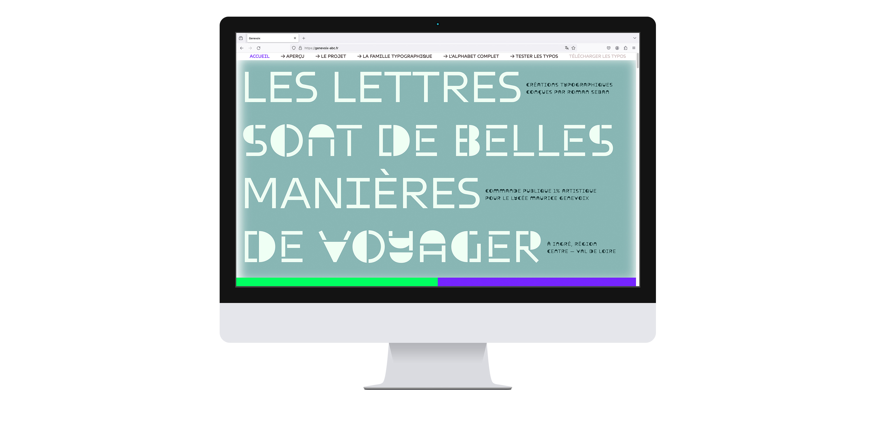 “Les lettres sont de belles manières de voyager” est un projet graphique réalisé dans le cadre du 1% artistique pour la construction de l’extension du lycée Maurice Genevoix, à Ingré (Région Centre-Val de Loire). Ce projet repose sur la création d’une famille de caractères typographiques pensée pour les habitants et habitantes du lycée. Pour accompagner le projet et voir ces alphabets à l’usage, divers objets graphiques et interventions, à différentes échelles, sont produits.