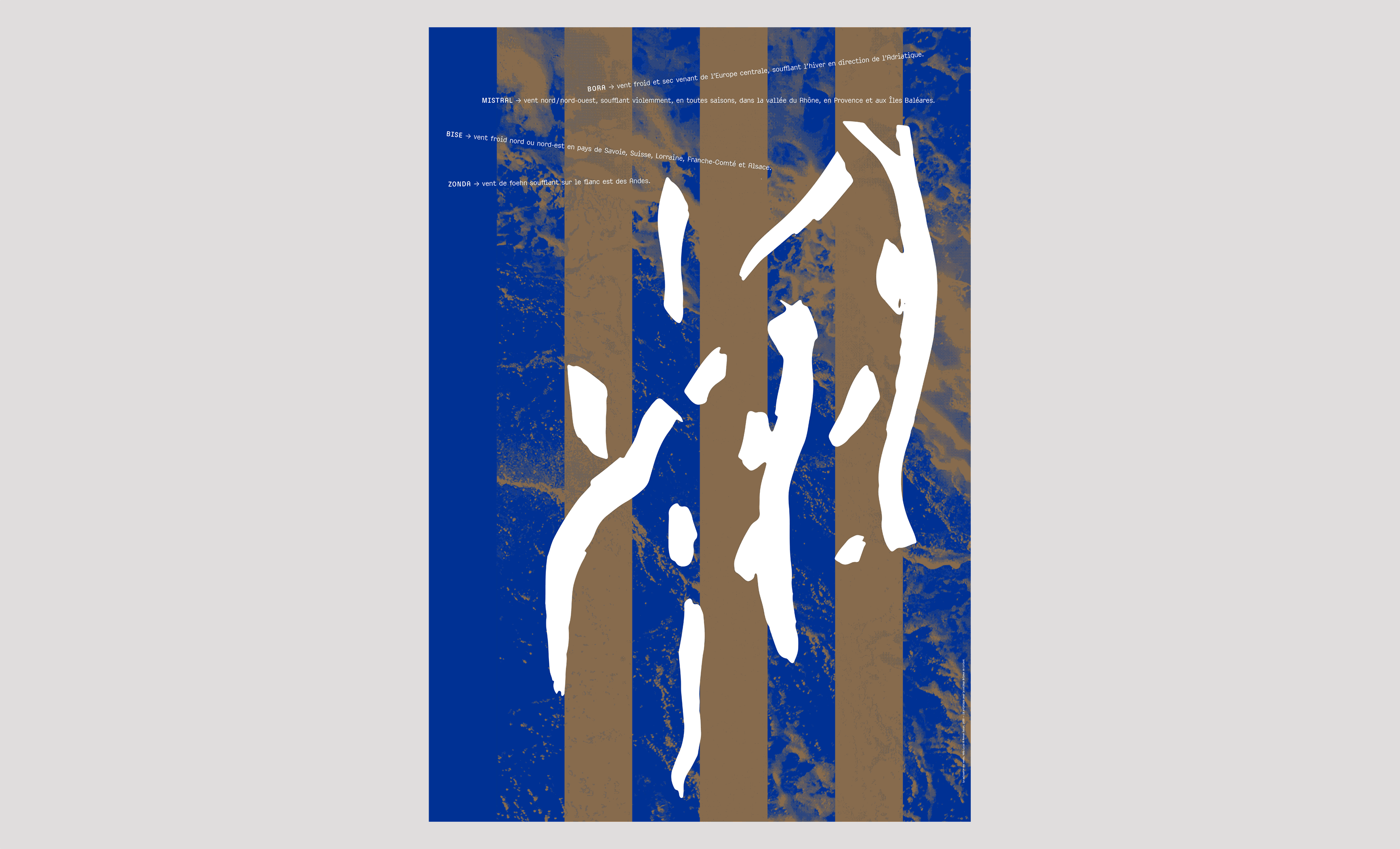 “La naissance des vents” associe des dimensions graphiques, linguistiques, géographiques à travers une intervention protéiforme qui parcourt le collège. Conjugant interventions signalétiques, créations d’objets graphiques et créations de polices de caractères originales, ce projet associe les collégiens et différents créateurs : l’écrivaine Hélèna Villovitch, les designers de Dreams Office, les photographes Florence Vesval et Daniel Challe, les ateliers d’impression Lézard graphique, Association Presse Offset, Média graphic, et le programmeur Olivier Jagut. S’intégrant à l’architecture du bâtiment conçu par l’agence DDL architectes, “La naissance des vents” invite à lever les yeux et regarder le ciel.
